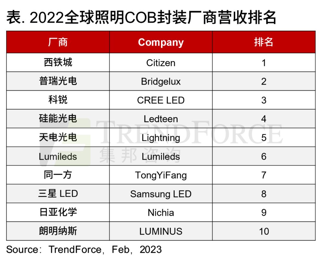 CREE是不断耕耘照明市场,主推主推大功率和COB产品,产品广泛应用于路灯、隧道灯及其他户外大功率照明产品。2022年受商业照明市场需求下滑的影响,CREE COB封装业务亦受到冲击,不过依旧排名第三。